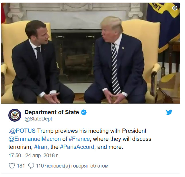 وجاءت تصريحات الرئيس الأمريكي خلال استقباله الرئيس الفرنسي إيمانويل ماكرون بالبيت الأبيض يوم الثلاثاء، علما أن اللقاء الأمريكي الفرنسي سيبحث مصير الاتفاق النووي الإيراني والوضع في سوريا.