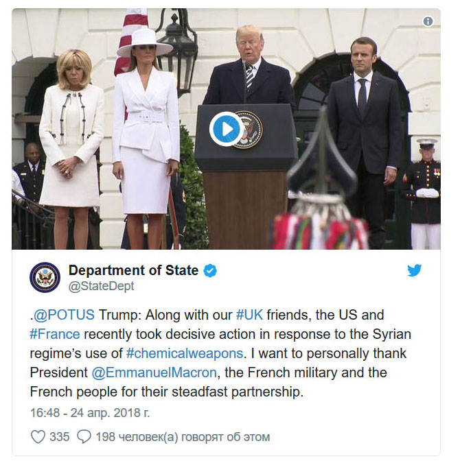 وفي وقت سابق، قال الرئيس الأمريكي دونالد ترامب إن الإدارة الأمريكية اتخذت قرار تنفيذ غارات في سوريا بالتنسيق مع الحكومة الفرنسية ردا على استخدام السلاح الكيميائي.